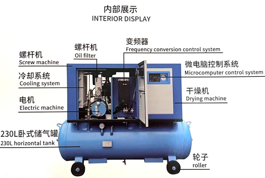 Meanwhile, this model is equipped with a wheel design (Remark: 4-in-1, with wheels), which can be moved flexibly, adjusted according to production needs, and adapted to different operation scenarios. It effectively solves the industry pain points of traditional split-type air compressors such as complex pipelines, cumbersome installation and large space occupation, and further improves the practicability and flexibility of the equipment.